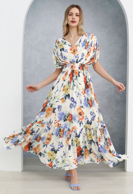 Wrap yourself in the essence of spring with this dress. This floral symphony in fabric form flutters with every step, mirroring the gentle dance of petals in a soft breeze. Its meticulously crafted pleats cascade down, creating a silhouette that whispers tales of elegance and renewal. Let it be your ode to the seasons of growth and beauty.