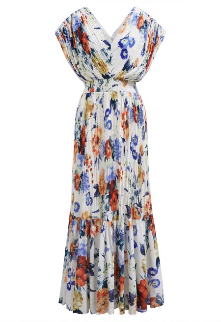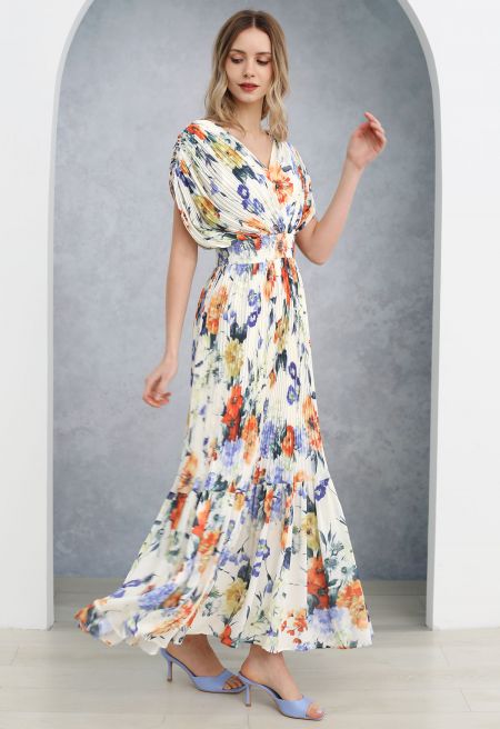 Wrap yourself in the essence of spring with this dress. This floral symphony in fabric form flutters with every step, mirroring the gentle dance of petals in a soft breeze. Its meticulously crafted pleats cascade down, creating a silhouette that whispers tales of elegance and renewal. Let it be your ode to the seasons of growth and beauty.